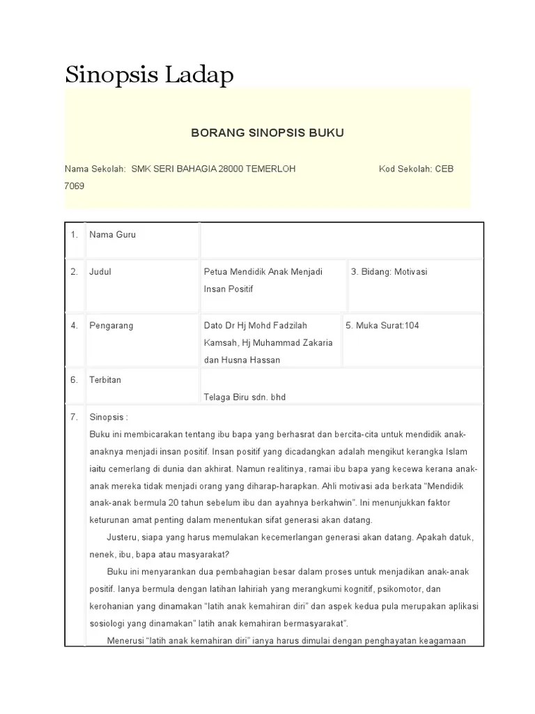 Contoh sinopsis buku untuk ladap. Panduan teori pelatihan dan contoh imam suyitno belbuk com. Beliau yakin dengan membawa nama ibu dan bapanya, kejayaan dan keberkatan dalam hidup akan . Lampiran c borang sinopsis buku nama sekolah: